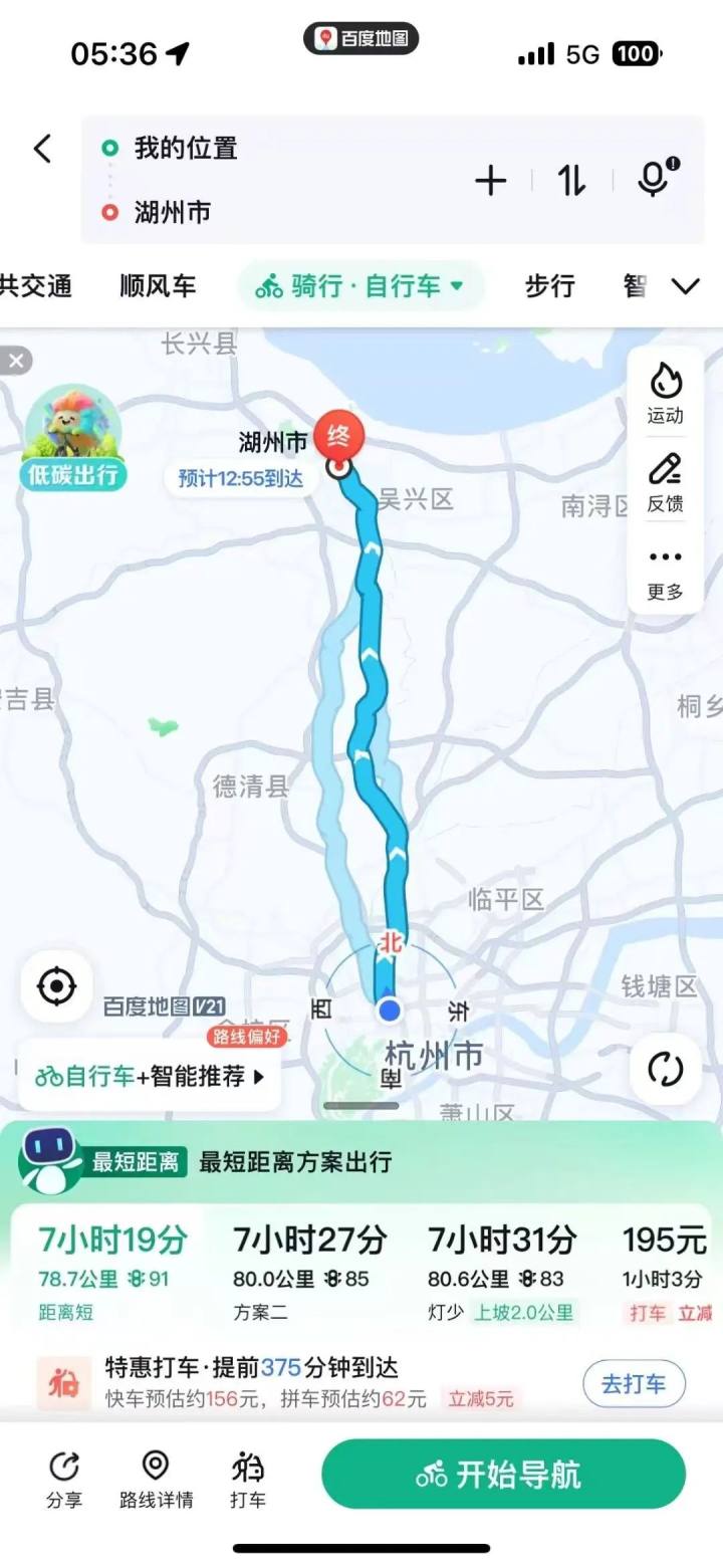 第一天的计划,从杭州骑到湖州,地图显示78公里,要骑行7小时19分钟。小宋把手机固定在车把上,出发。