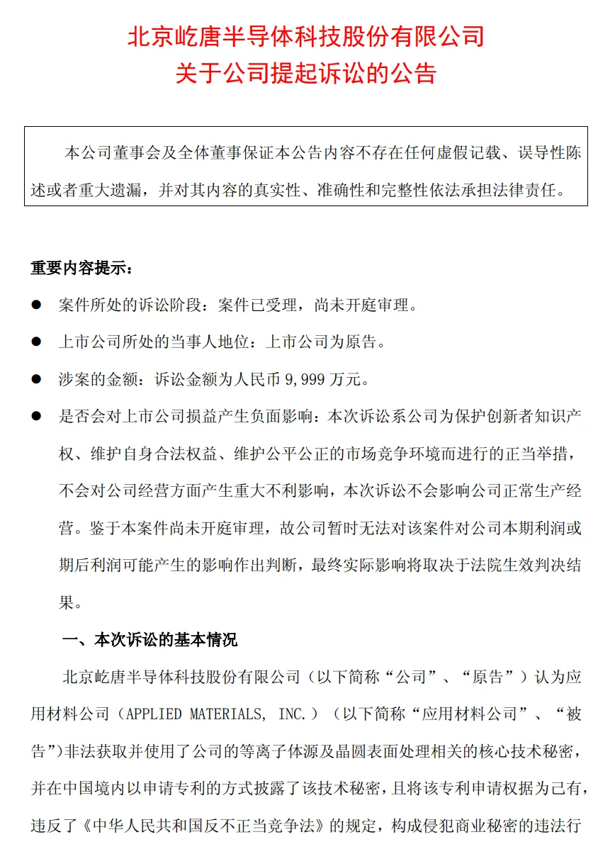 8月13日,国内半导体设备龙头北京屹唐半导体科技股份有限公司(以下简称“屹唐股份”)公告称,公司因认为应用材料公司(APPLIED MATERIALS, INC.)非法获取并使用了公司的等离子体源及晶圆表面处理相关的核心技术秘密,在中国境内以申请专利的方式披露了该技术秘密,且将该专利申请权据为己有,违反了《中华人民共和国反不正当竞争法》的规定,构成侵犯商业秘密的违法行为,向北京知识产权法院提起诉讼,诉讼金额为人民币9999万元。