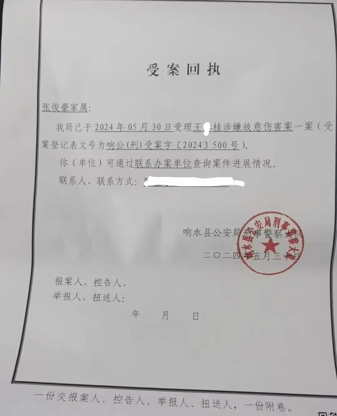 张俊豪家属提供的受案回执显示,响水县公安局称该局已于2024年5月30日受理王某桂涉嫌故意伤害一案。记者致电办案民警,未得到回复。