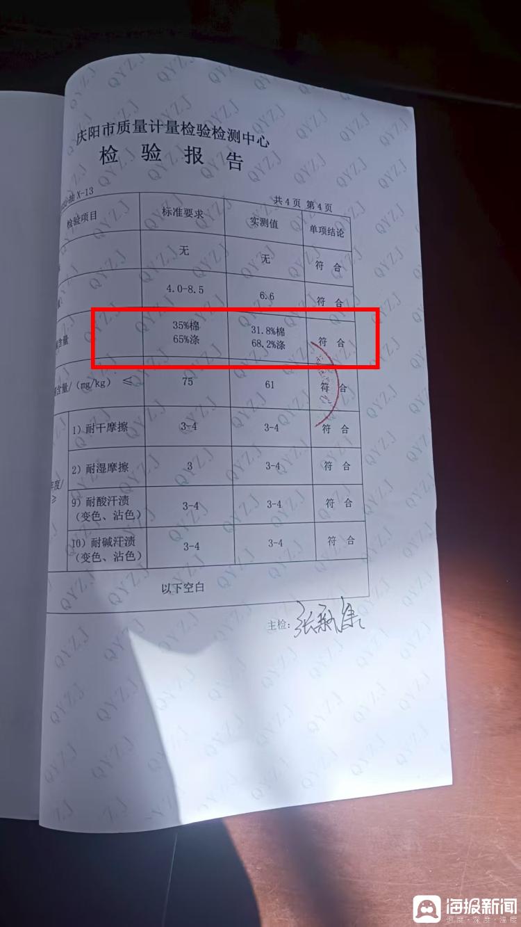 此外,庆阳市质量计量检验检测中心对夏季校服抽样检测发现其棉含量为31.8%、涤含量为68.2%,不符合夏季校服棉含量不得低于35%的国家标准。但检测报告认为,春秋季校服单项评定标准为符合;夏季校服所检项目符合本次监督抽查要求。