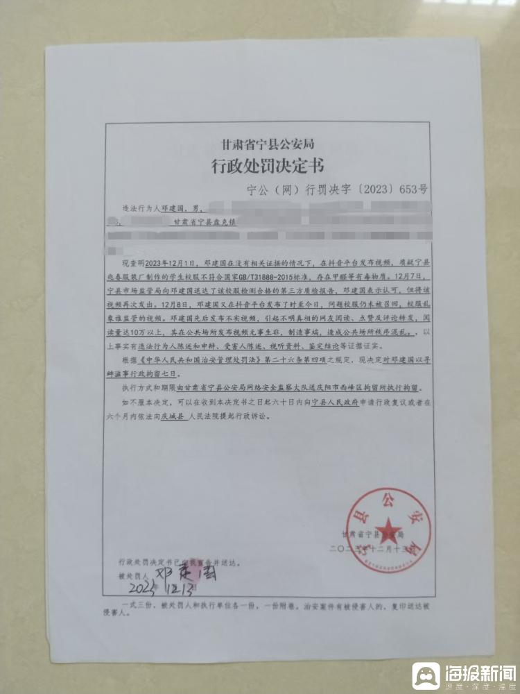2023年12月13日宁县公安局网安大队作出行政处罚决定。《行政处罚决定书》载明,邓建国在没有相关证据的情况下,在抖音平台发布视频,质疑兆春服装厂制作的学生校服不符合国家标准,存在甲醛等有毒物质。宁县市场监管局向邓建国送达了该校服检测合格的第三方质检报告,邓建国表示认可,但仍将视频再次发布。警方认为,邓建国先后发布不实视频,引起不明真相的网友阅读、点赞及评论转发,阅读量达10万以上,其在公共场所发布视频无事生非、制造事端,造成公共场所秩序混乱。遂决定对邓建国以寻衅滋事行政拘留七日。