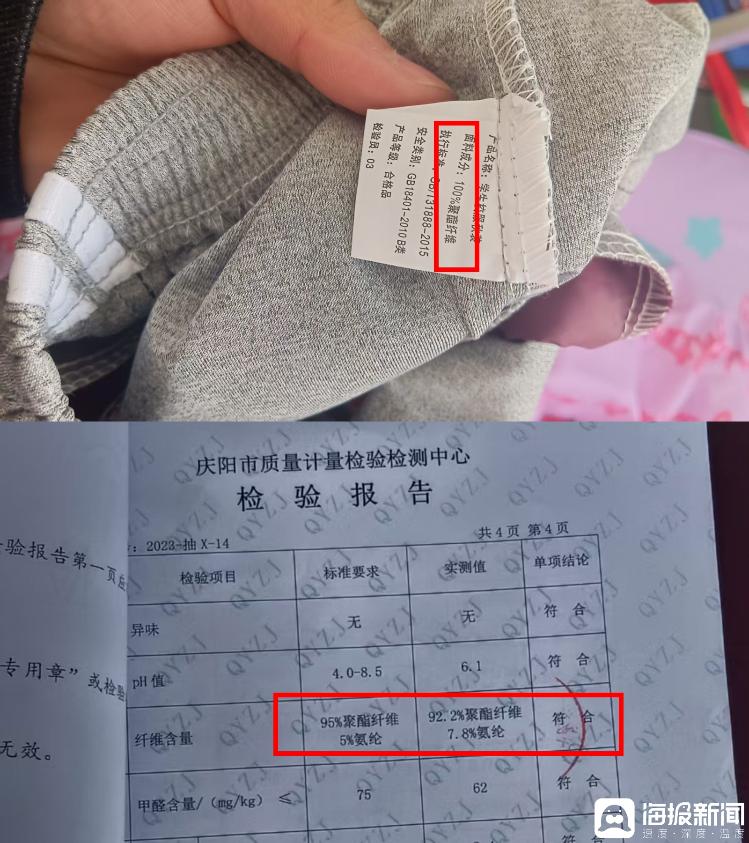 相关检测报告显示,春秋季校服的标签标注为100%聚酯纤维,但检测结果为聚酯纤维94.9%、氨纶5.1%,标签成分与检测结果不符。
