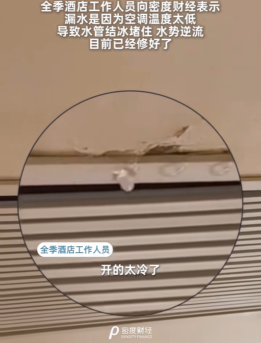 8月14日消息,有网友在社交平台发帖表示,入住全季酒店后,晚上一点钟,房间莫名有流水声起床一看,竟然是一条水柱从天降。从网友分享的视频来看,房间洗手池前多处漏水,空调出风口旁墙壁已被泡烂,地面也已经有不少积水。对此,全季酒店工作人员向密度财经表示,漏水是因为空调温度太低,导致水管结冰堵住,水势逆流,目前已经修好。