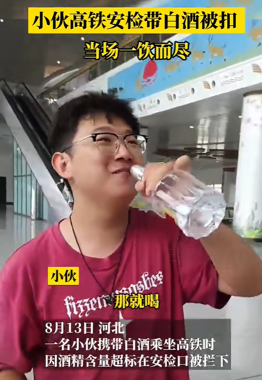 近日,小伙小黄参加完聚会,带了一瓶开过封的五粮液去赶高铁,过安检时被告知这瓶开封的白酒不能带上列车。因为赶时间,小黄便在高铁车站安检口上演了一段现实版《人在囧途》中的桥段。两分钟内,他喝完8两五粮液,同行的朋友还给他录了视频。