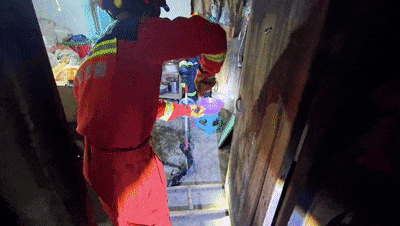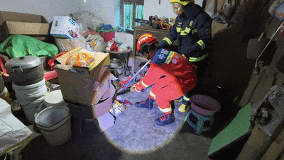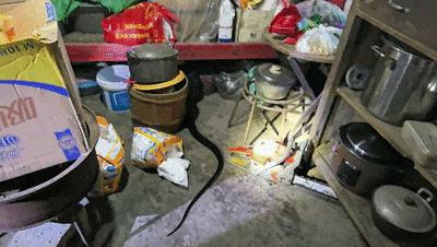 根据报警人指引,消防员来到蛇藏身的杂物间进行搜索,发现蛇正藏匿在杂物堆下。
