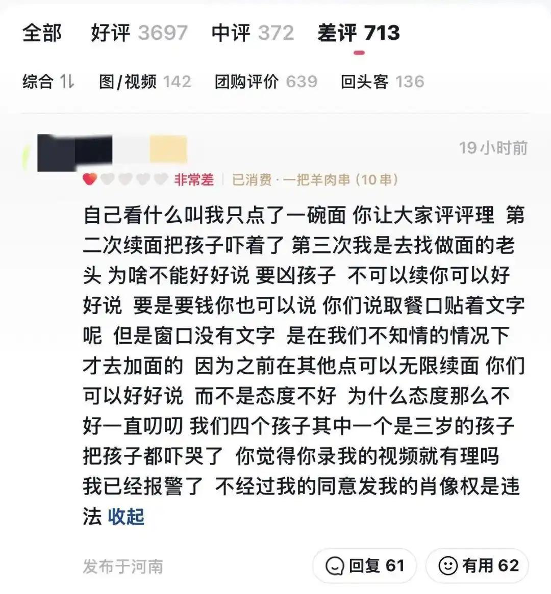 近日,一段“3位女子带4孩点一碗面多次免费续面”视频在网络上传播。视频中,面店老板指责一位女顾客续两次面不够,转头在平台给他打差评。