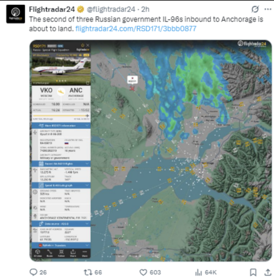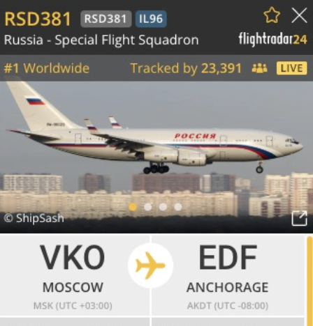据航班追踪网站FlightAware14日消息,当天一架伊尔-96-300飞机已经从俄罗斯莫斯伏努科沃机场飞抵美国阿拉斯加州的埃尔门多夫-理查森联合军事基地(代码EDF)。据称,这架飞机隶属于俄罗斯特勤飞行大队,注册号为RA-96023,该飞机沿极地航线飞过北极,途经白令海峡,最终进入美国领空,抵达阿拉斯加,飞行时间约10个小时。报道称,这架飞机上可能载有一些俄罗斯谈判团的代表。