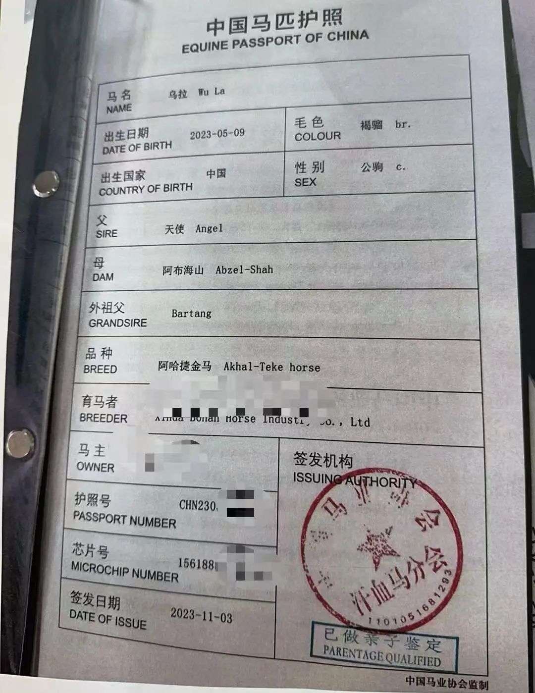 ▲马匹证件