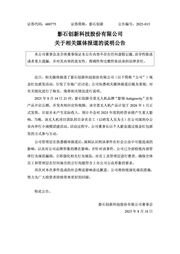 近日,相关媒体报道了影石创新科技股份有限公司(以下简称“公司”)现金红包派发活动,引发了市场广泛讨论。公司知悉相关媒体报道后极为重视,对有关情况进行了核实,现将相关情况进行说明。
