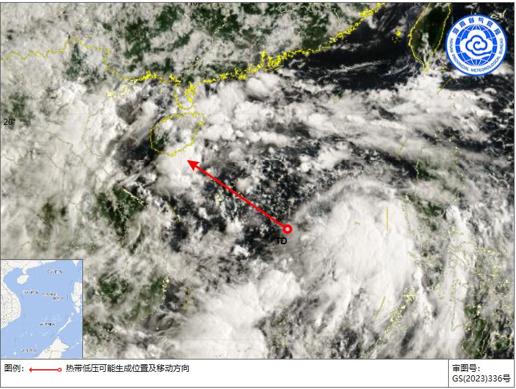 图南海热带低压可能生成位置及移动方向示意图(底图为风云四号卫星云图)