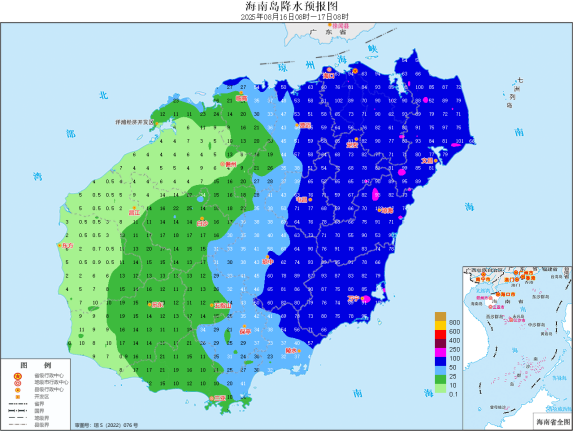 预计,16日11时~19日08时各地累积雨量:海口、临高、澄迈、定安、文昌、琼海、万宁、屯昌、琼中、儋州、白沙和陵水等市县150~250毫米、局地300毫米;昌江、东方、乐东、五指山、保亭和三亚等市县80~150毫米。