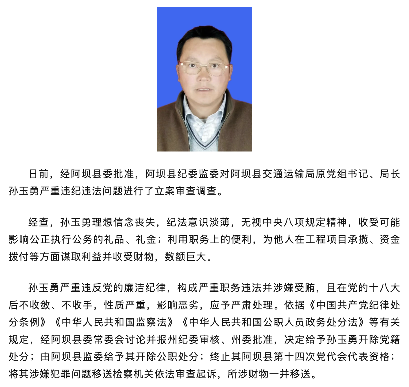 日前,经阿坝县委批准,阿坝县纪委监委对阿坝县交通运输局原党组书记、局长孙玉勇严重违纪违法问题进行了立案审查调查。