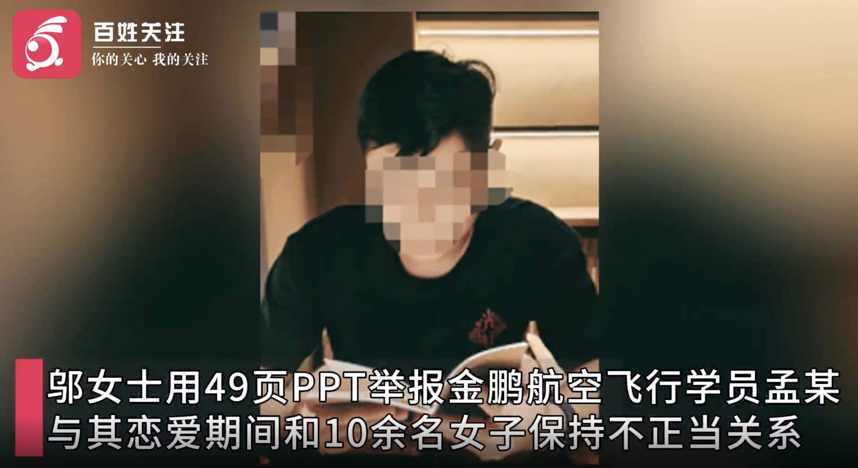 8月15日,上海邬女士通过49页PPT举报金鹏航空飞行学员孟某,与其恋爱期间和10余名女子保持不正当关系。PPT内容显示,邬女士以6点为契机,对孟某进行控诉以及起诉。其中7月10日两人聊天记录显示,邬女士拆穿孟某谎言对方一直要求见面详谈。