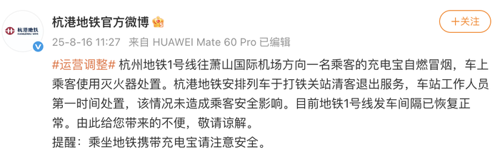 8月16日上午10点30分左右,有网友发帖称,地铁1号线往萧山国际机场的列车从西湖文化广场站出站后,有乘客发现最后一节车厢传出浓烟,列车到达打铁关站后,乘车都被地铁工作人员叫下了车,列车清空后开走了。@杭港地铁官方微博发文称:杭州地铁1号线往萧山国际机场方向一名乘客的充电宝自燃冒烟,车上乘客使用灭火器处置。杭港地铁安排列车于打铁关站清客退出服务,车站工作人员第一时间处置,该情况未造成乘客安全影响。目前地铁1号线发车间隔已恢复正常。由此给您带来的不便,敬请谅解。