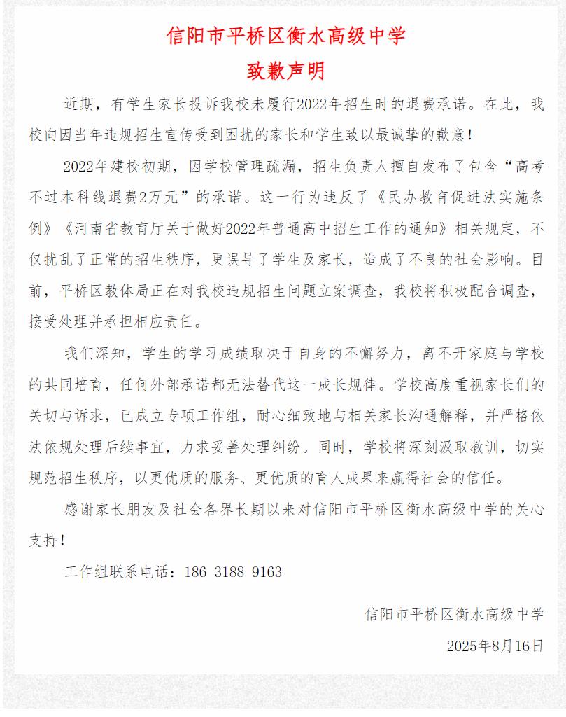 2022年建校初期,因学校管理疏漏,招生负责人擅自发布了包含“高考不过本科线退费2万元”的承诺。这一行为违反了《民办教育促进法实施条例》《河南省教育厅关于做好2022年普通高中招生工作的通知》相关规定,不仅扰乱了正常的招生秩序,更误导了学生及家长,造成了不良的社会影响。目前,平桥区教体局正在对我校违规招生问题立案调查,我校将积极配合调查,接受处理并承担相应责任。