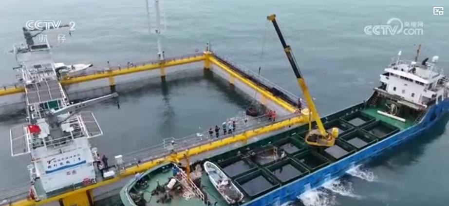 截至目前,广东累计培育国家审定海水新品种18个,数量全国领先。2024年海水鱼苗产量67.96亿尾,约占全国一半,连续7年居全国首位。另一方面,广东省通过不断的技术创新,发展现代化海洋牧场。在广东湛江,重力式深水网箱漂浮在海面上,这样一个周长90米的重力养殖网箱,1年能养约10万斤鱼。