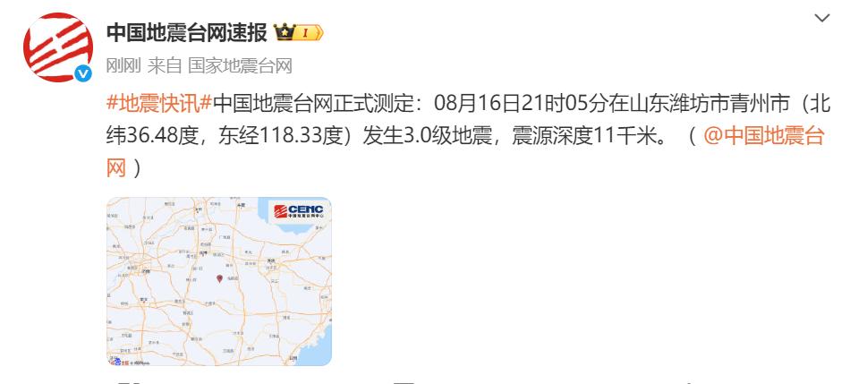 中国地震台网正式测定:08月16日21时05分在山东潍坊市青州市(北纬36.48度,东经118.33度)发生3.0级地震,震源深度11千米。