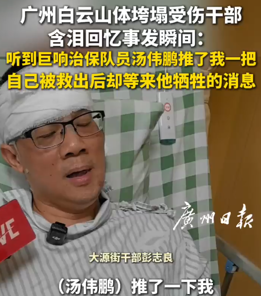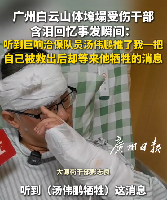 8月7日下午,广州日报记者在白云区人民医院创伤骨科病床上见到大源街干部彭志良,前一天下午他接受了三个小时的手术,头部、双臂及双膝有多处外伤。他的神情十分哀恸,不仅是因为身上的伤痛,更因为遇难的群众和牺牲的同事汤伟鹏。垮塌发生前,彭志良和汤伟鹏正在颐雅苑二巷10号门口劝导群众尽快撤离。