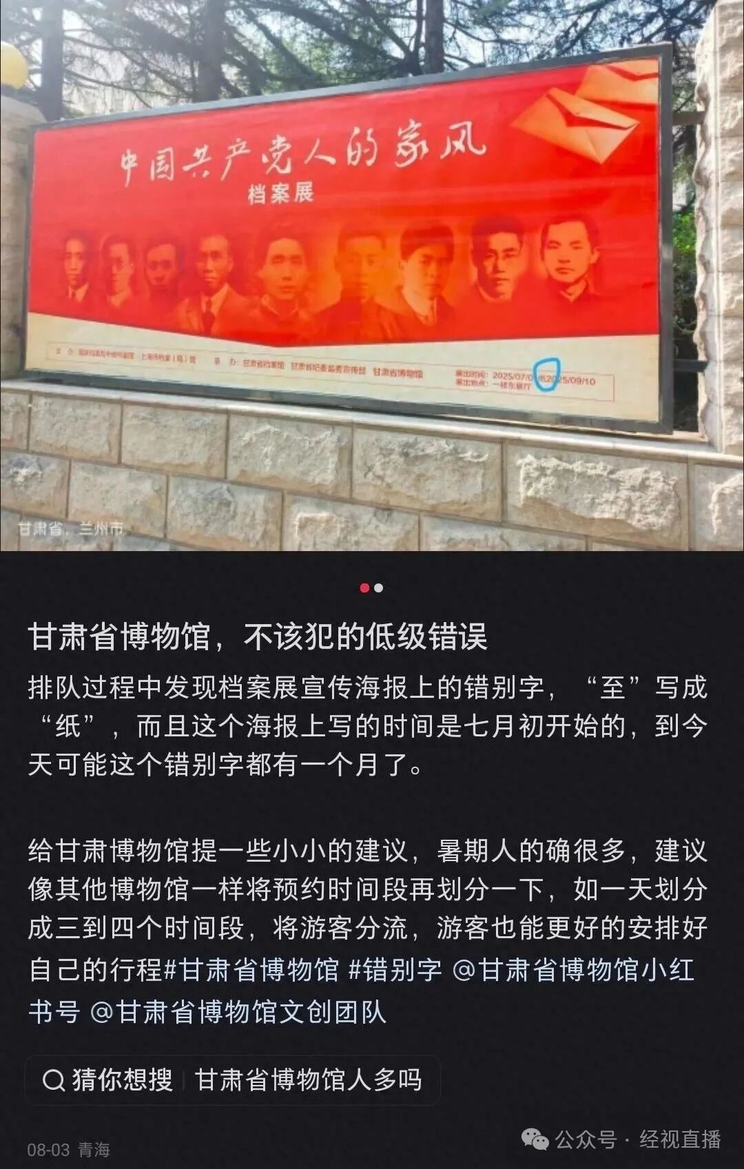 近日,有网友发帖称,甘肃省博物馆一宣传海报出现一处明显错别字。网友上传图片显示,博物馆户外一处名为“中国共产党人的家风”档案展宣传海报中,展出时间中的“2025/07/01至2025/09/10”中的“至”写成了“纸”。发布者指出,这实属不该犯的低级错误,且该展览开展至今已一月有余,却一直未被更正。
