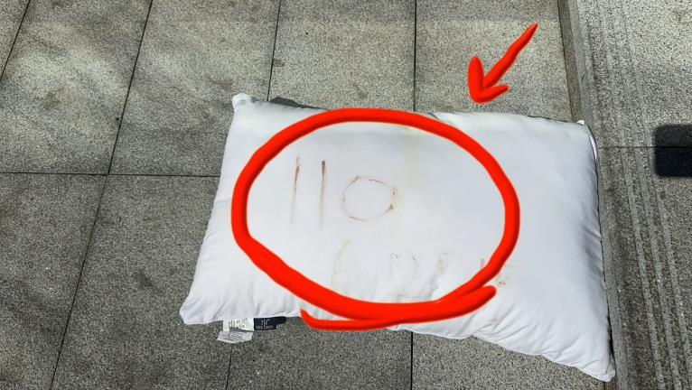 张焜:那天下午,我送餐到世豪荟小区后出来,刚到大门口,突然有东西从高空掉下来,落在我面前的台阶上。然后我看清是一只白色枕头,上面有红色的“110 625”的字样, 最后还有两个不太清晰的数字,像是“15”。