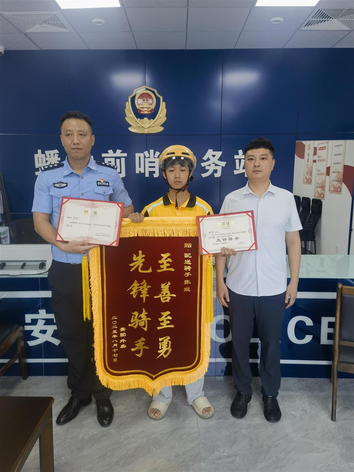 8月15日,周女士来到彭山路派出所蟠龙前哨警务站,为民警送上锦旗表达感激。而那名外卖小哥名叫张焜,是美团的一名兼职骑手,在获悉其相关事迹后,美团外卖授予张焜“先锋骑手”的荣誉称号,为他发放了2000元奖金、锦旗和证书,鼓励其在他人危急时刻伸出援手的行为。