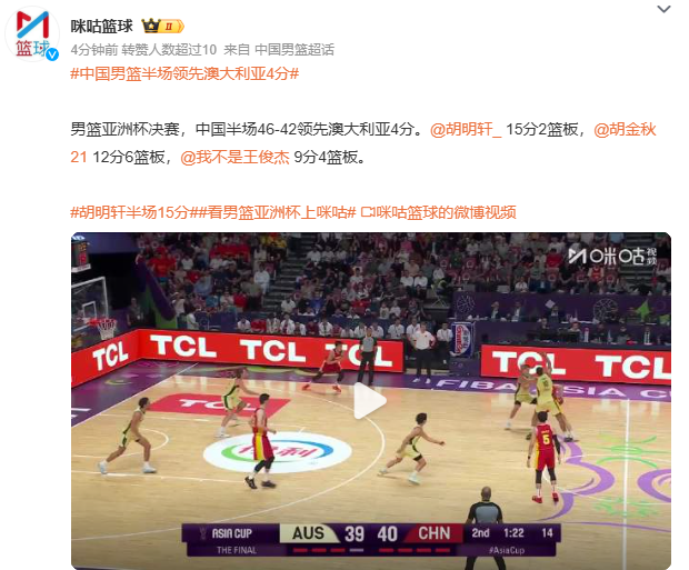 男篮亚洲杯决赛,中国半场46-42领先澳大利亚4分。@胡明轩_ 15分2篮板,@胡金秋21 12分6篮板,@我不是王俊杰 9分4篮板。