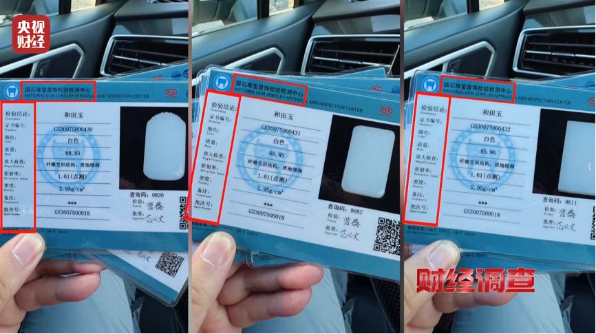 这些和田玉“鉴定证书”的出具机构为“国石珠宝首饰检验检测中心”,证书上颜色、质量、折射率、密度等信息样样俱全,扫描二维码也能显示鉴定内容。
