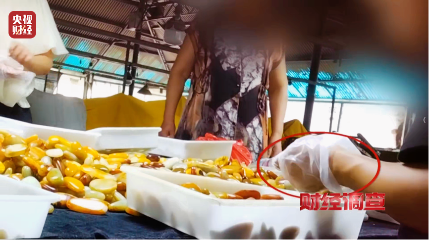 摊主坦言,这些是用化学药剂染色的假籽料。