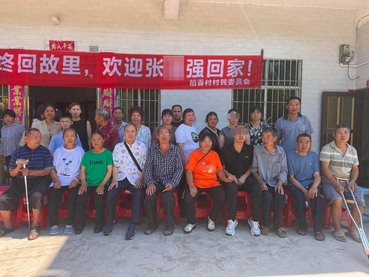 8月17日,位于公路边的老张家张灯结彩,喜庆的气球沿公路排开,进门处台阶上搭出气球拱门,告诉路人这家“有喜事”,墙上挂着柏香村村委会制作的“寻亲三十六载终回故里,欢迎张某强回家”的红色条幅。当车队到来,人们燃放鞭炮,热情地迎接张某强回家。