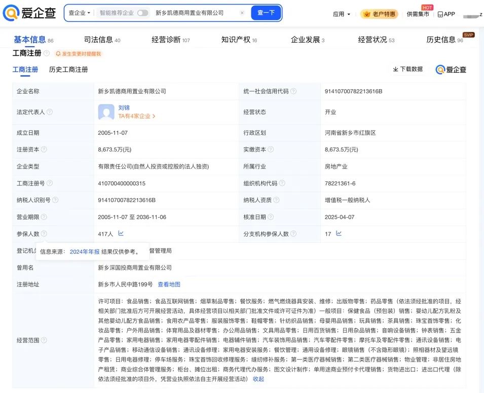 爱企查App显示,新乡胖东来关联公司新乡凯德商用置业有限公司成立于2005年11月,法定代表人为刘锦,注册资本8673.5万元人民币,经营范围包括食品销售、食品互联网销售、烟草制品零售、餐饮服务等。股东信息显示,该公司由新乡市爱的家园商贸有限公司全资持股。年报信息显示,2024年,该公司参保人数为417人。
