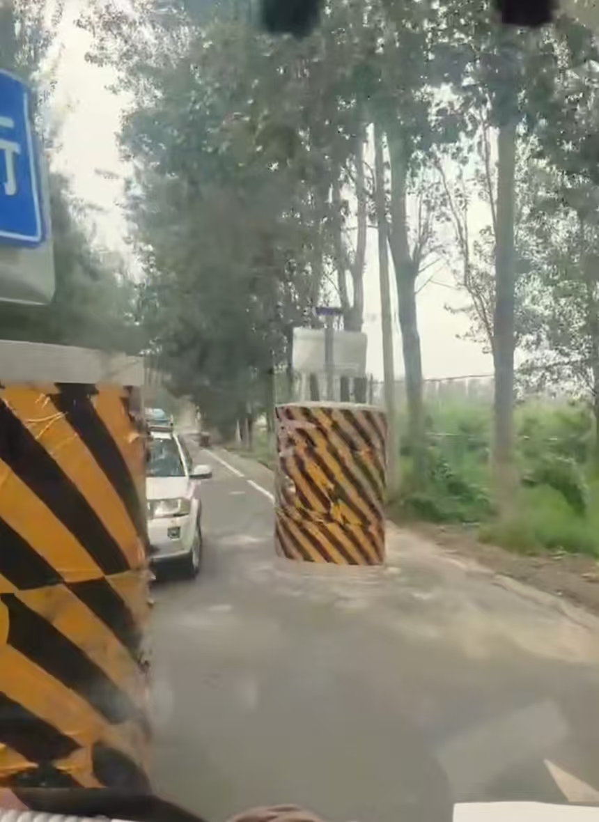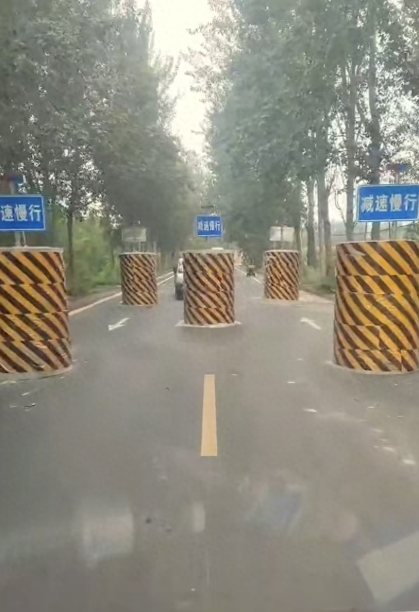 多个视频显示,在廊坊葛渔城镇一道路,出现数个粗壮高大的路障,并标有“减速慢行”字样,有网友驾驶小型车辆缓慢绕桩通过。有网友称,该路障位于廊坊葛渔城镇一乡镇道路。