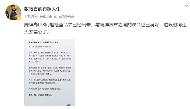 同时,该博主还在微博发文称,魏牌高山8问题检查结果已出,与魏牌汽车之间的误会也已消除。并附上魏牌官方的声明。声明显示,在此次事件中,魏牌始终秉持解决问题、追求真相的态度。对于用户在使用车辆过程中出现的问题,绝不推诿、负责到底,很欣慰双方关注的问题和误解最终都得以澄清。
