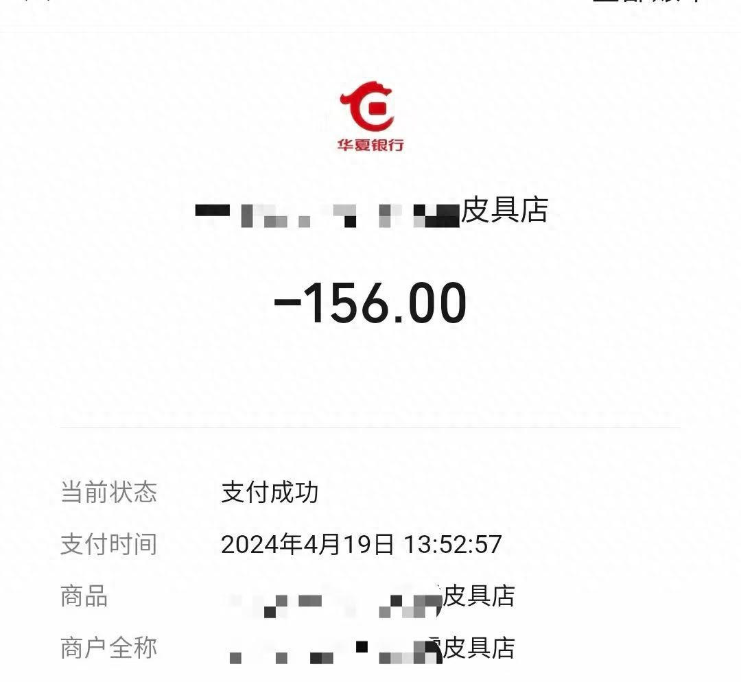 支付记录显示,2024年4月19日下午1时52分,陈先生向大连新天地广场某皮具店支付了156元。