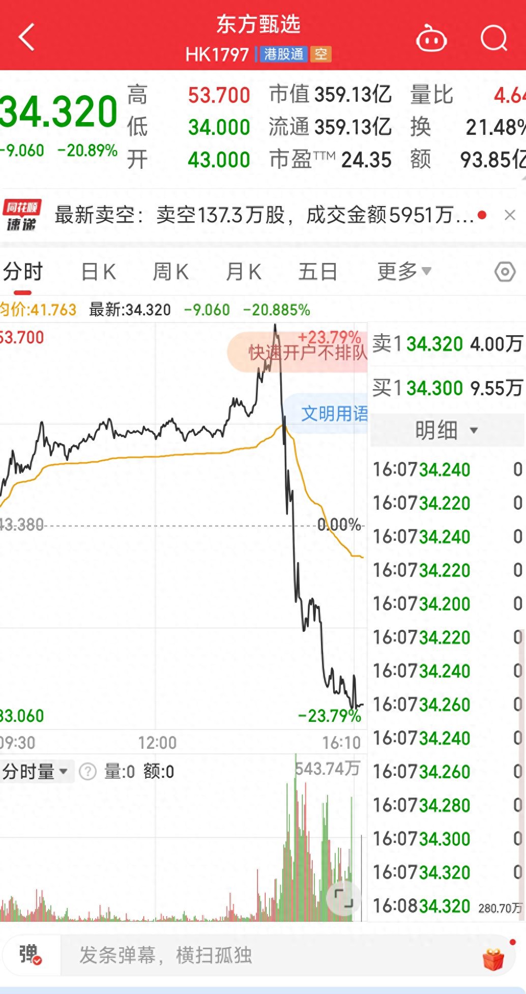 8月19日下午,东方甄选股价大跳水。14时50分至16时,短短一个多小时,东方甄选股价从上涨23.56%,跳水至下跌20.89%,报收34.32港元/股。