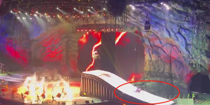 视频显示,马戏表演现场观众众多,摩托飞车特技项目中,6名特技演员驾驶摩托车表演,目测飞跃高度至少六七米。第5名特技演员驾车飞跃过程中,摩托车着陆疑似出现意外,车辆倒地,演员摔倒后滚下坡道。