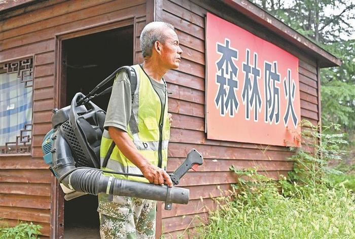 ▲护林员周云鹏身背灭火工具上山作业。