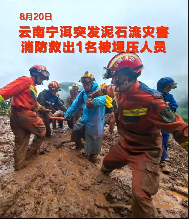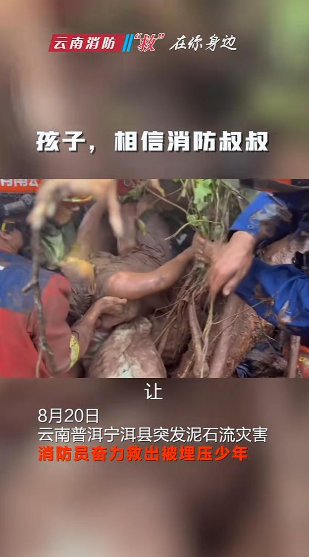 云南省消防救援总队发布的视频显示,多名消防员从被泥石流覆盖的树草丛中拉出来一个孩子。在拉出来前,救援人员鼓励孩子“坚持一下,我们一起用力”“缓口气、缓口气,接力、接力”。消防在视频中称,“孩子生命体征平稳,已紧急送医治疗。”
