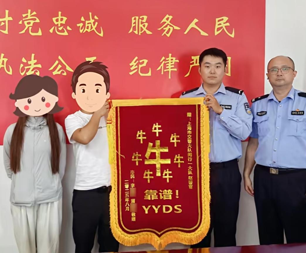 伤者家属事后给帮助救援的民警同志送上锦旗,上面有8个“牛”字,大赞上海警方“靠谱”“YYDS”。