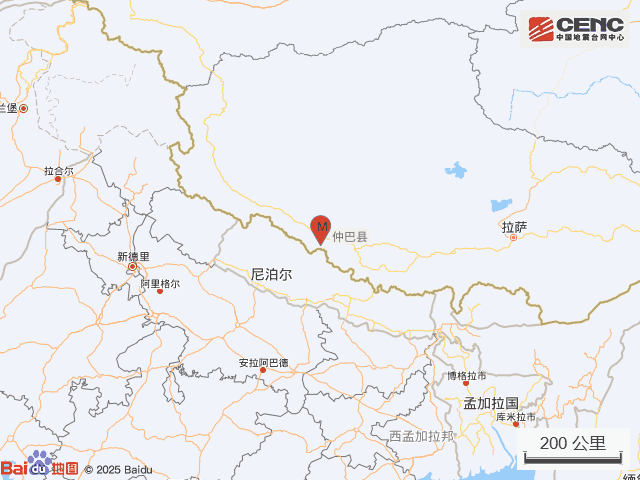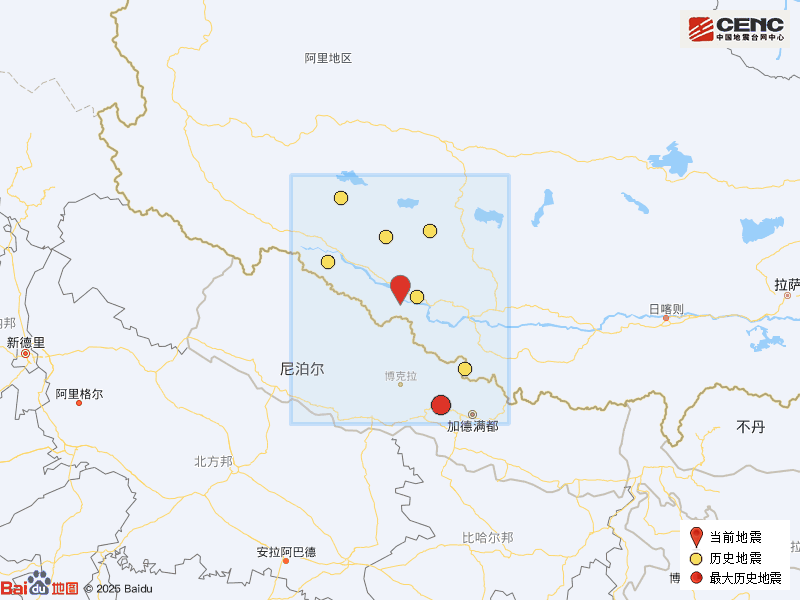 历史地震:根据中国地震台网速报目录,震中周边200公里内近5年来发生3级以上地震共8次,最大地震是2023年10月22日在尼泊尔发生的5.0级地震(距离本次震中211公里),历史地震分布如图。