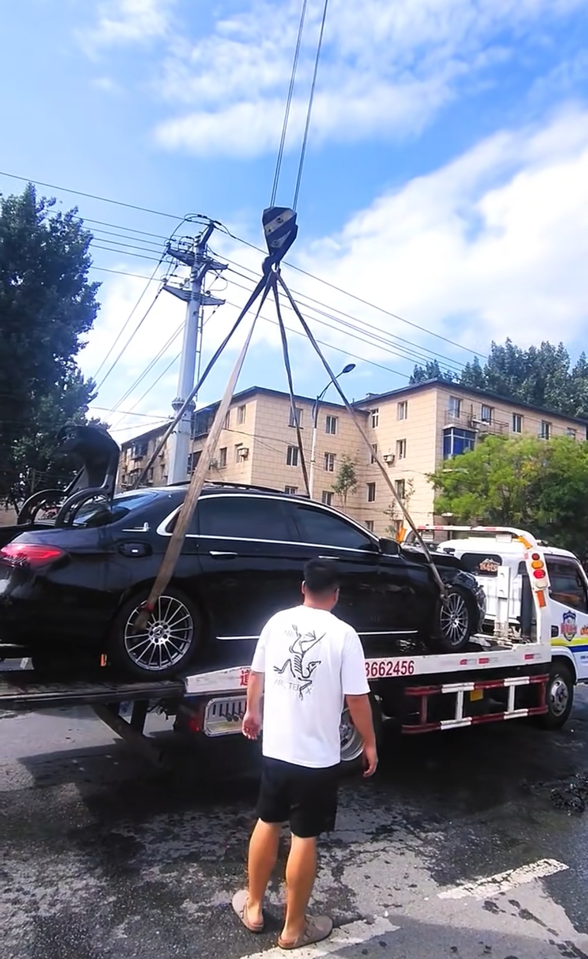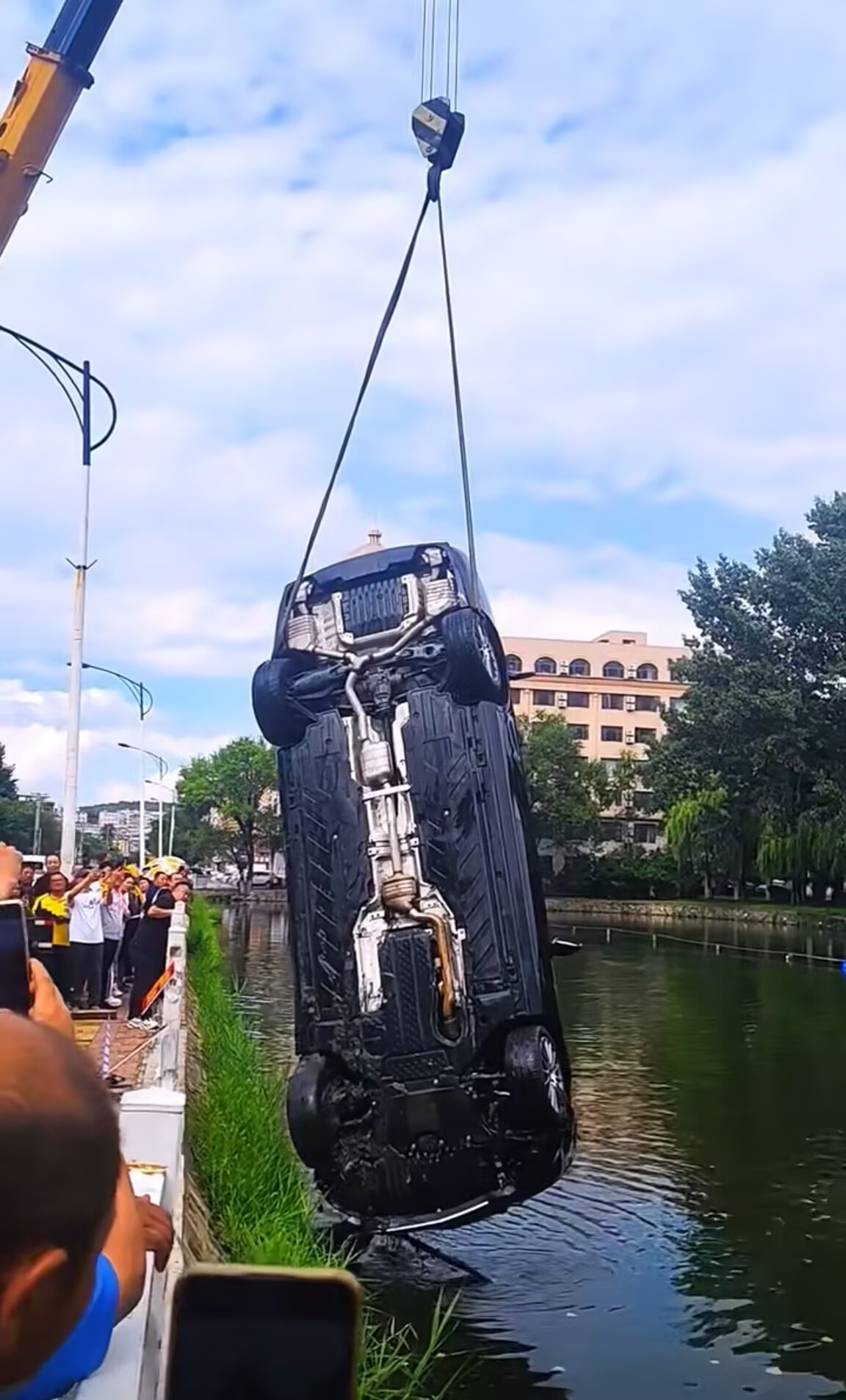 视频显示,一辆车已经没入水中,红色尾灯还亮着。事后,有其他网友在评论区贴出了救援照片,被吊起来的是一辆奔驰E级轿车。