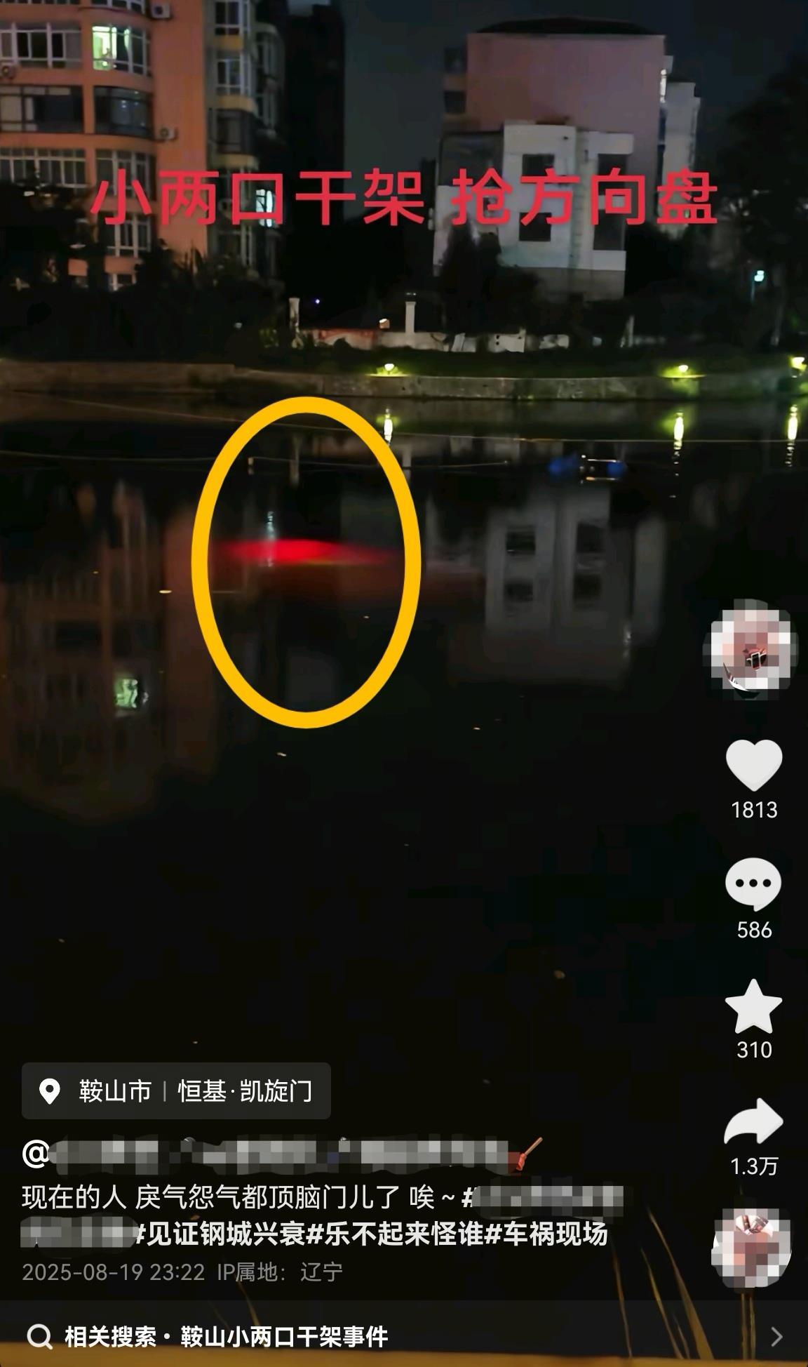 8月19日晚,有辽宁鞍山网友发视频称,小两口干架抢方向盘,奔驰豪车冲进园林路边的湖里,幸亏在车沉没之前,有看湖的大爷划船救了两人。