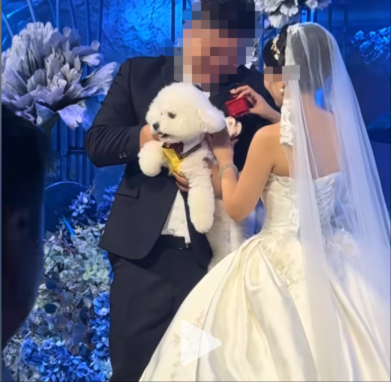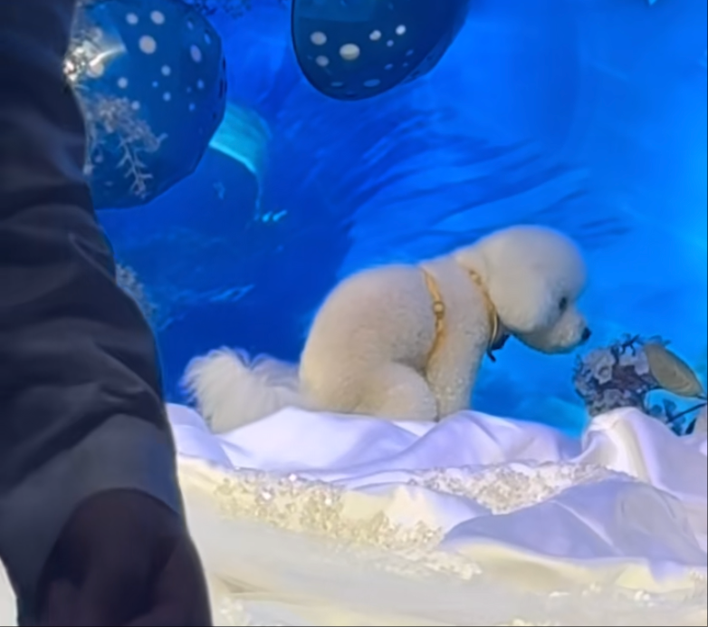 据网友发布的视频显示,新人特意设计了 “宠物送戒” 的浪漫环节:可爱的比熊犬戴着定制背带,背着戒指盒走上舞台,新郎抱起狗狗取出戒指后将其放下。可意外突然发生,狗狗走到舞台边缘角落时突然停下脚步,当众排便,瞬间打破了预设的浪漫节奏。现场宾客也从最初的惊喜转为忍俊不禁,大家被这场意外逗得笑意不停,纷纷拿出手机记录下这个最 “特别” 的片段。
