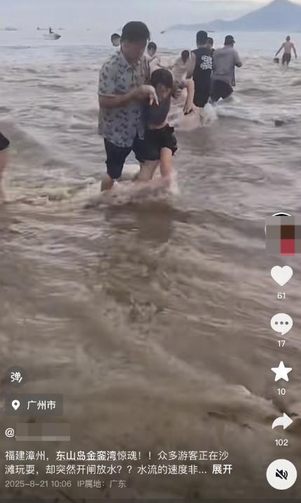 8月20日,有网友发视频称,福建省漳州市东山岛金銮湾,“众多游客正在沙滩玩耍,却突然开闸放水?水流的速度非常快,堪比山洪,几秒钟就把原本的沙滩全部淹没!眼看着冲走好几个人。”