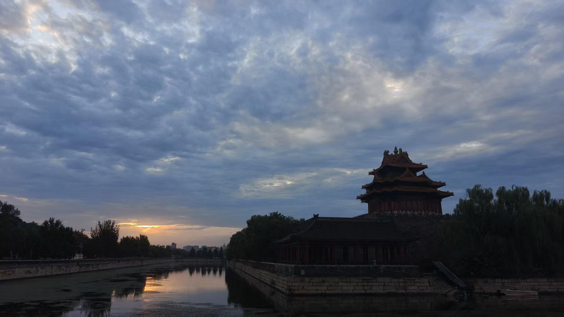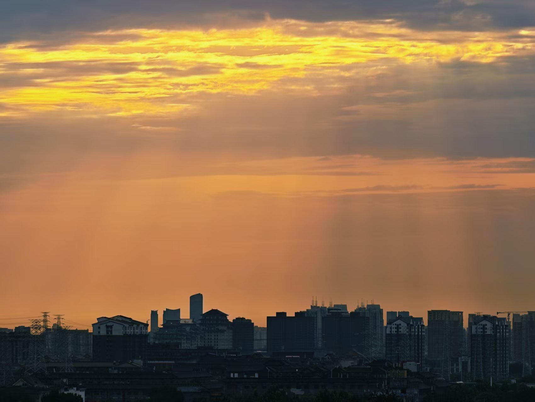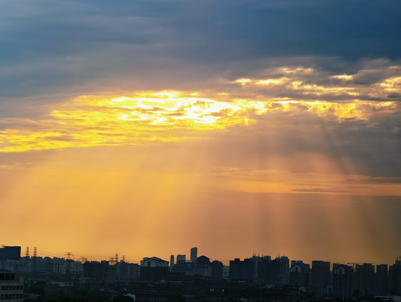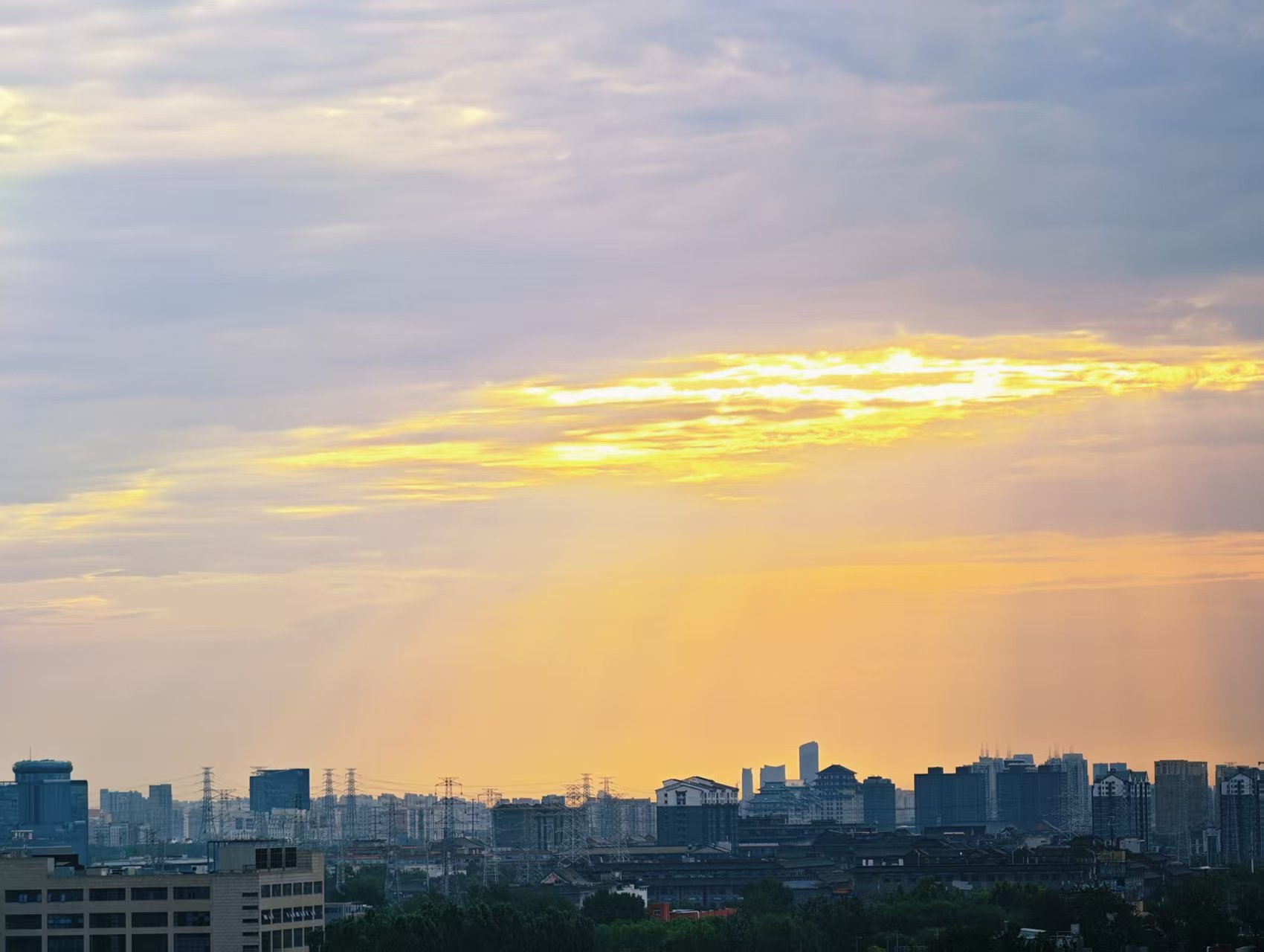 今晨,瑰丽霞光穿透云层,北京出现绝美丁达尔光