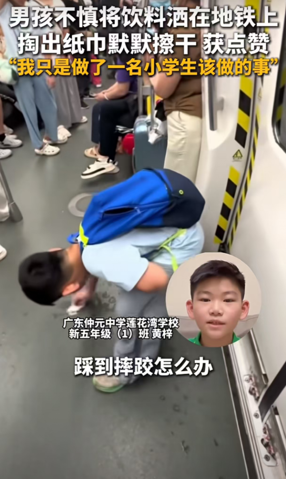 8月15日,广州地铁五号线上有位小朋友不慎将饮料洒在地上,自觉从书包里拿出纸巾弯腰擦干净,此举获得众多网友点赞,还被人民日报点名表扬。