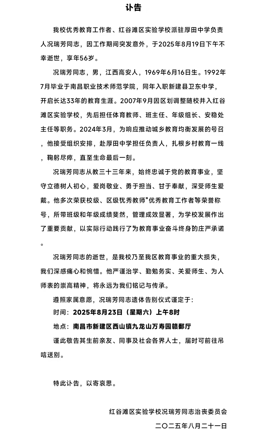 据江西省南昌市红谷滩区实验学校8月21日发布的讣告,该校优秀教育工作者、红谷滩区实验学校派驻厚田中学负责人况瑞芳同志,因工作期间突发意外,于2025年8月19日下午不幸逝世,享年56岁。