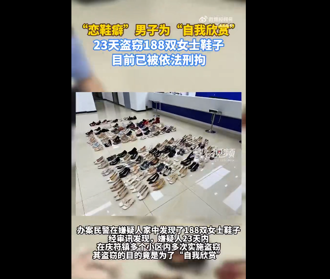 接警后,民警根据群众提供的线索识别出嫌疑人身份,并立即组织开展抓捕。办案民警在嫌疑人家中发现了188双女士鞋子,经审讯发现,嫌疑人23天内,在庆符镇多个小区内多次实施盗窃,其盗窃的目的竟是为了“自我欣赏”。目前嫌疑人已被依法刑拘,案件仍在进一步调查中。