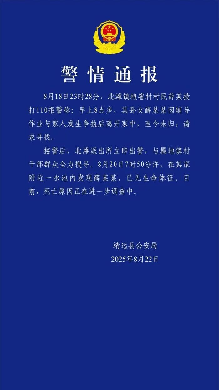 8月22日,甘肃省靖远县公安局通报:8月18日23时28分,北滩镇粮窖村村民薛某拨打110报警称:早上8点多,其孙女薛某某因辅导作业与家人发生争执后离开家中,至今未归,请求寻找。