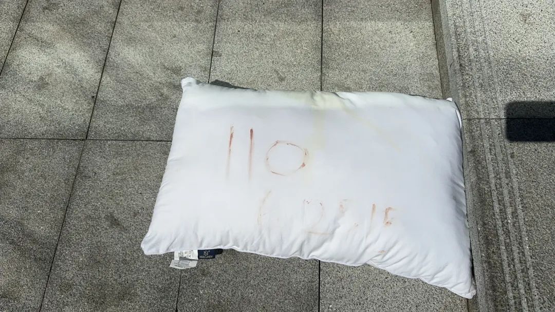 一个“血书枕头”闯入外卖小哥张焜的视野中。它在空中划出一个抛物线,落在张焜面前的台阶上。