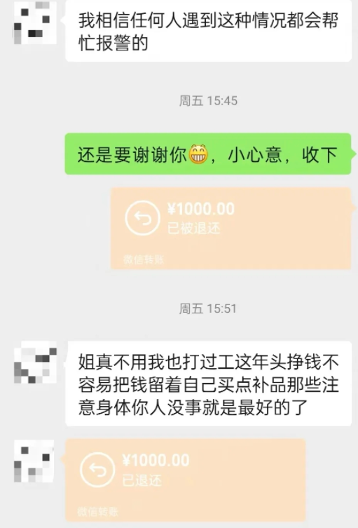 事后,我拿着锦旗,送到了彭山路派出所,又要来了那位帮我报警的外卖小哥的联系方式,加上微信。这位美团外卖小哥是一位大学生,趁暑假打工挣生活费。我给他转去1000块钱,但他没有收。后来,听说美团和这位同学老家犍为县人民政府都颁发了奖励,我心里也算是有了一丝安慰。
